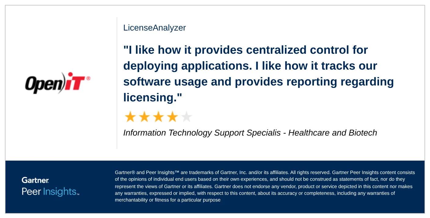 As of October 13, 2025, Open iT LicenseAnalyzer has an Overall Rating of 4.5 out of 5 in the Software Asset Management Tools, based on reviews published from October 2024 to October 2025 on Gartner Peer InsightsTM.